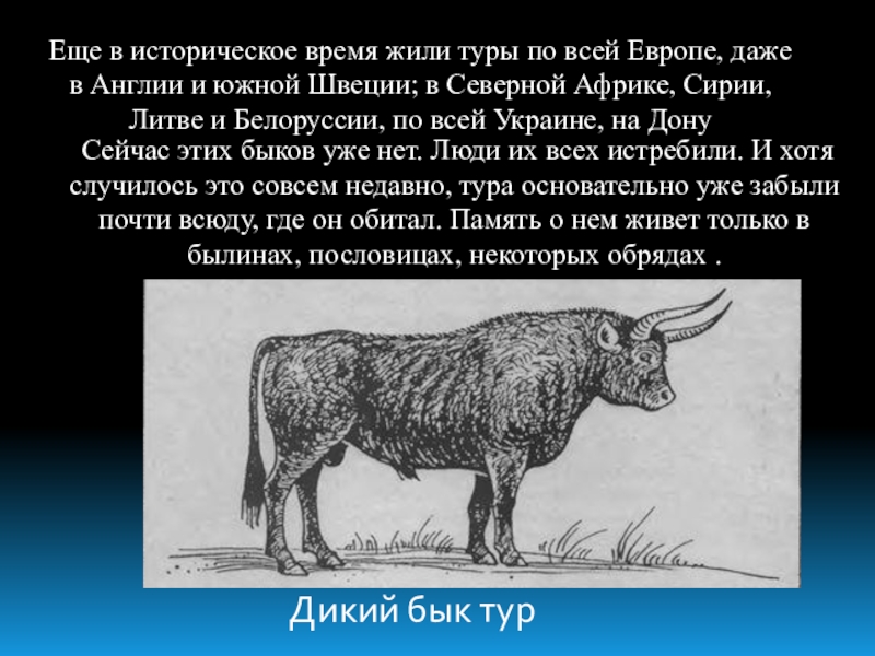 Еще в историческое время жили туры по всей Европе, даже в Англии и южной Швеции; в Северной Африке, Сирии, Литве и Белоруссии, по всей Украине, на Дону