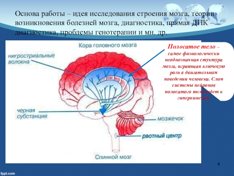 самое физиологически неоднозначная стуктура мозга, играющая ключевую роль в двигательном поведении человека. Слом системы нейронов полосатого тела ведет к гиперкинезам.