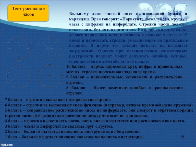 10 баллов – норма, нарисован круг, цифры в правильных местах, стрелки показывают заданное время.