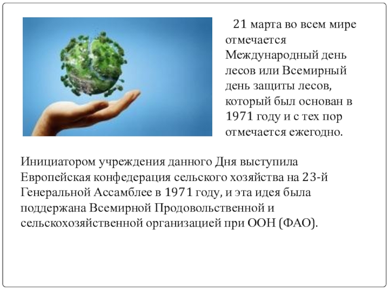 Инициатором учреждения данного Дня выступила Европейская конфедерация сельского хозяйства на 23-й Генеральной Ассамблее в 1971 году, и эта идея была поддержана Всемирной Продовольственной и сельскохозяйственной организацией при ООН (ФАО).