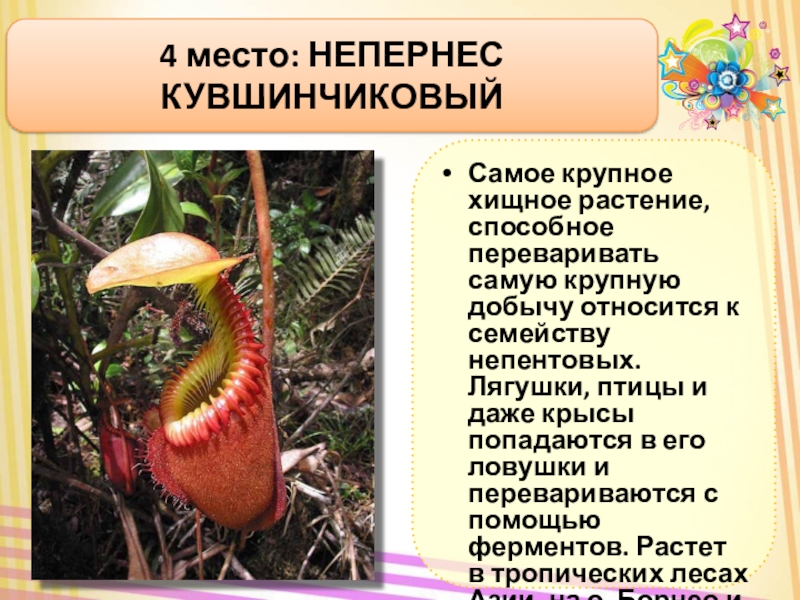 4 место: НЕПЕРНЕС КУВШИНЧИКОВЫЙСамое крупное хищное растение, способное переваривать самую крупную добычу относится к семейству непентовых. Лягушки,