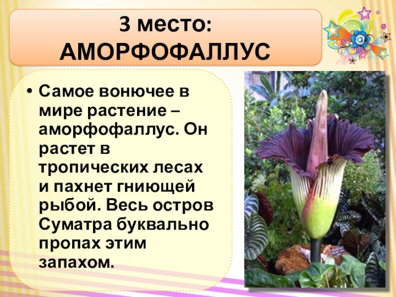 3 место: АМОРФОФАЛЛУС Самое вонючее в мире растение – аморфофаллус. Он растет в тропических лесах и пахнет