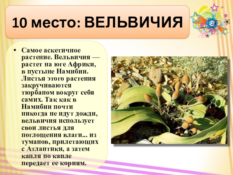 10 место: ВЕЛЬВИЧИЯ Самое аскетичное растение. Вельвичия — растет на юге Африки, в пустыне Намибии. Листья этого