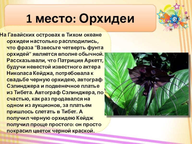 что фраза "Взвесьте четверть фунта орхидей" является вполне обычной. Рассказывали, что Патриция Аркетт, будучи невестой известного актера Николаса Кейджа, потребовала к свадьбе черную орхидею, автограф Сэлинджера и подвенечное платье из Тибета. Автограф Сэлинджера, по счастью, как раз продавался на одном из аукционов, за платьем пришлось слетать в Тибет. А получил черную орхидею Кейдж получил проще простого: он просто покрасил цветок черной краской.