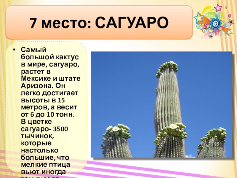 и штате Аризона. Он легко достигает высоты в 15 метров, а весит от 6 до 10 тонн. В цветке сагуаро- 3500 тычинок, которые настолько большие, что мелкие птица вьют иногда там гнезда.