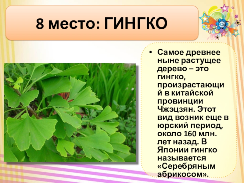 8 место: ГИНГКОСамое древнее ныне растущее дерево – это гингко, произрастающий в китайской провинции Чжэцзян. Этот вид