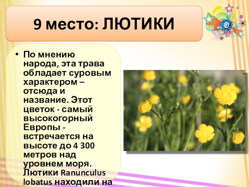 9 место: ЛЮТИКИПо мнению народа, эта трава обладает суровым характером – отсюда и название. Этот цветок -