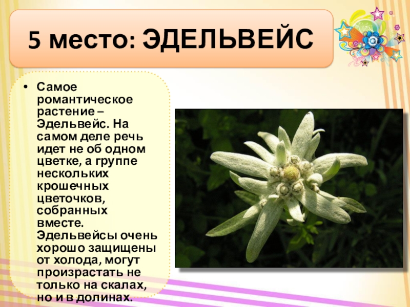 5 место: ЭДЕЛЬВЕЙССамое романтическое растение – Эдельвейс. На самом деле речь идет не об одном цветке, а