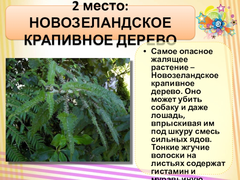2 место: НОВОЗЕЛАНДСКОЕ КРАПИВНОЕ ДЕРЕВОСамое опасное жалящее растение –Новозеландское крапивное дерево. Оно может убить собаку и даже