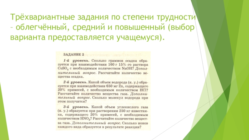 Слайд 7Трёхвариантные задания по степени трудности – облегчённый, средний и повышенный (выбор