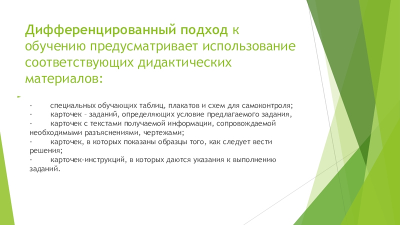 Слайд 6Дифференцированный подход к обучению предусматривает использование соответствующих дидактических материалов:
