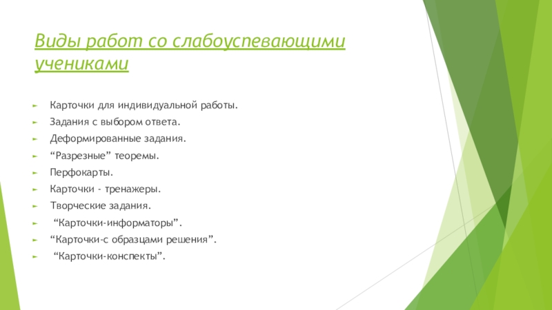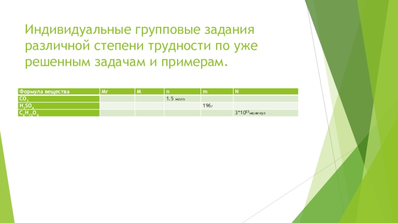 Слайд 10Индивидуальные групповые задания различной степени трудности по уже решенным задачам и