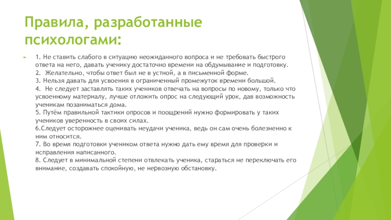 требовать быстрого ответа на него, давать ученику достаточно времени на обдумывание и подготовку.