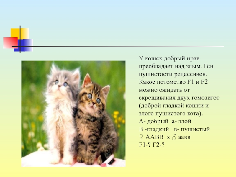 Слайд 14У кошек добрый нрав преобладает над злым. Ген пушистости рецессивен. Какое