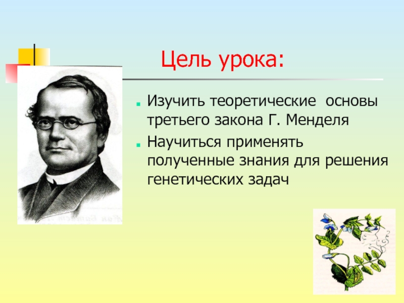 Цель урока:Изучить теоретические основы третьего закона Г. МенделяНаучиться применять полученные знания для решения генетических задач