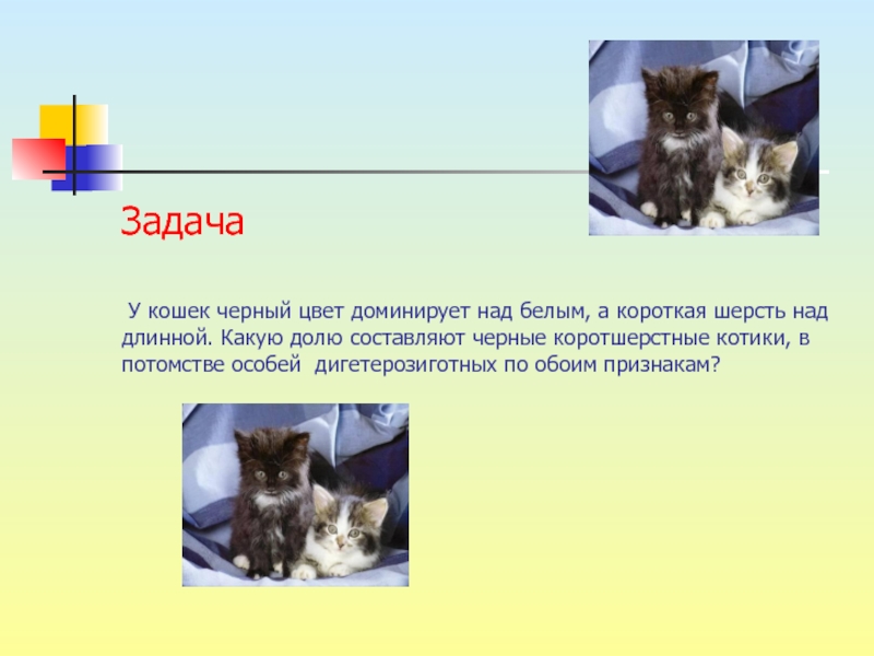 Слайд 12 У кошек черный цвет доминирует над белым, а короткая шерсть