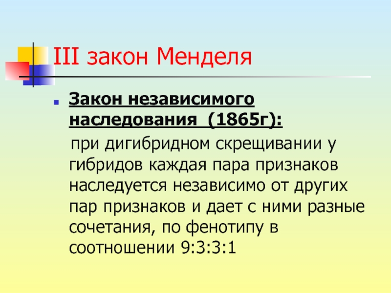III закон МенделяЗакон независимого наследования (1865г):  при дигибридном скрещивании у гибридов каждая пара признаков наследуется независимо