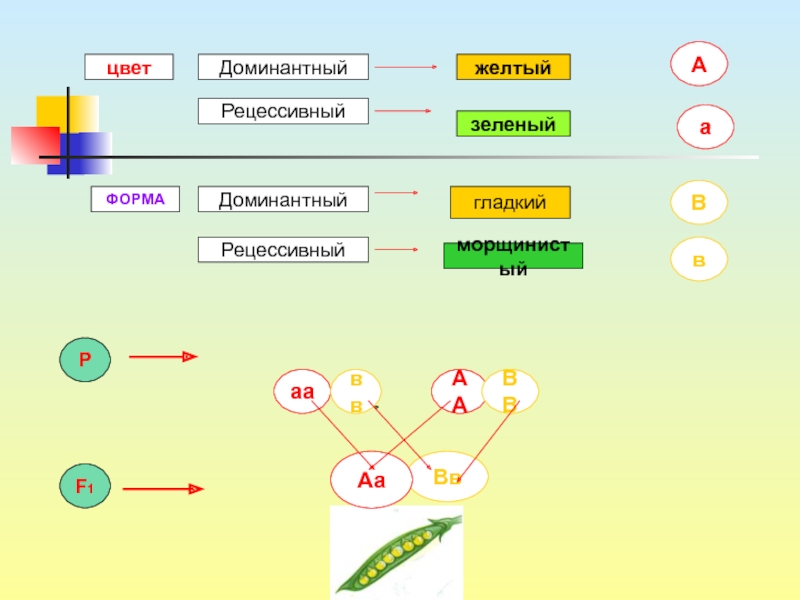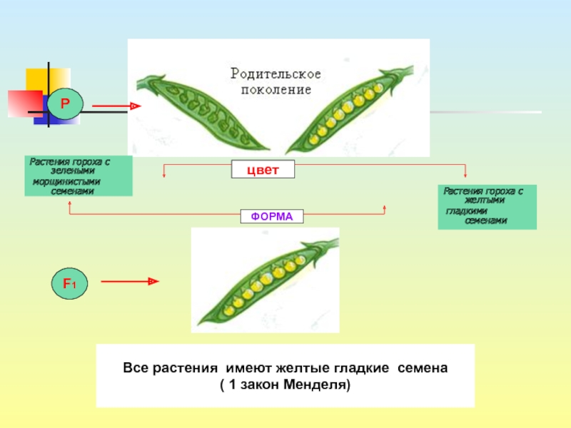 Растения гороха с зелеными морщинистыми семенамиРастения гороха с желтыми гладкими семенамиPцветФОРМАF1Все растения имеют желтые гладкие семена( 1