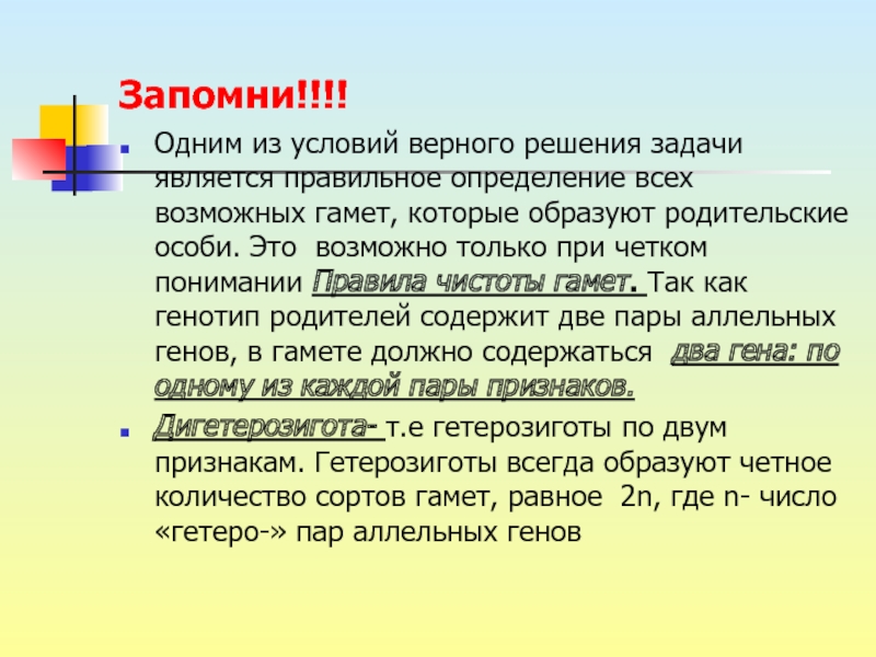 Запомни!!!!Одним из условий верного решения задачи является правильное определение всех возможных гамет, которые образуют родительские особи. Это