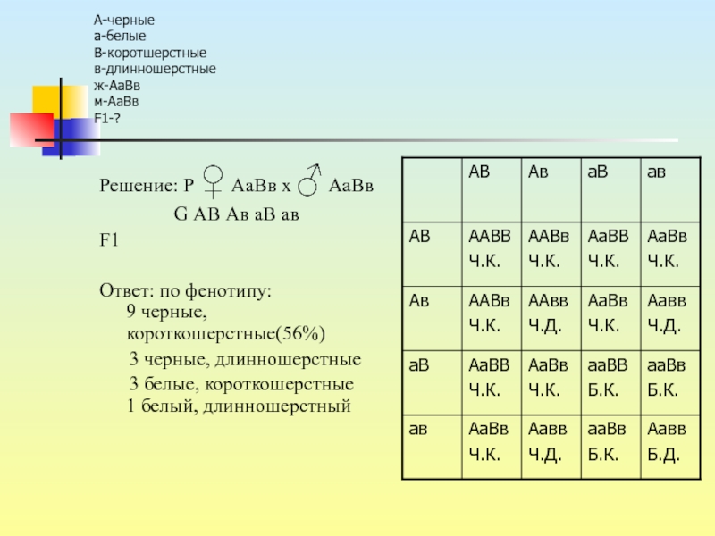 А-черные а-белые В-коротшерстные в-длинношерстные ж-АаВв м-АаВв F1-?Решение: Р ♀ АаВв х ♂ АаВв