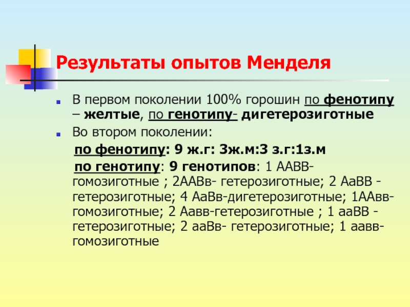 Результаты опытов МенделяВ первом поколении 100% горошин по фенотипу – желтые, по генотипу- дигетерозиготныеВо втором поколении: