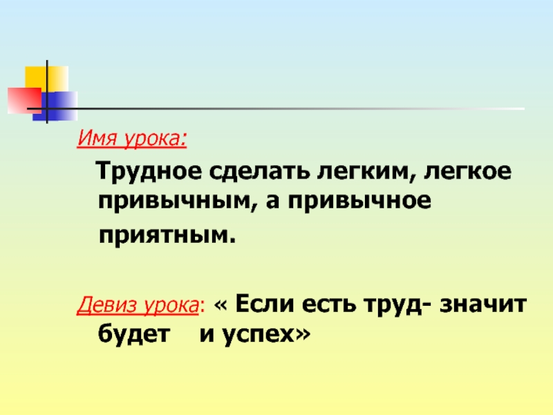 Имя урока:  Трудное сделать легким, легкое привычным, а привычное  приятным.Девиз урока: « Если есть труд-