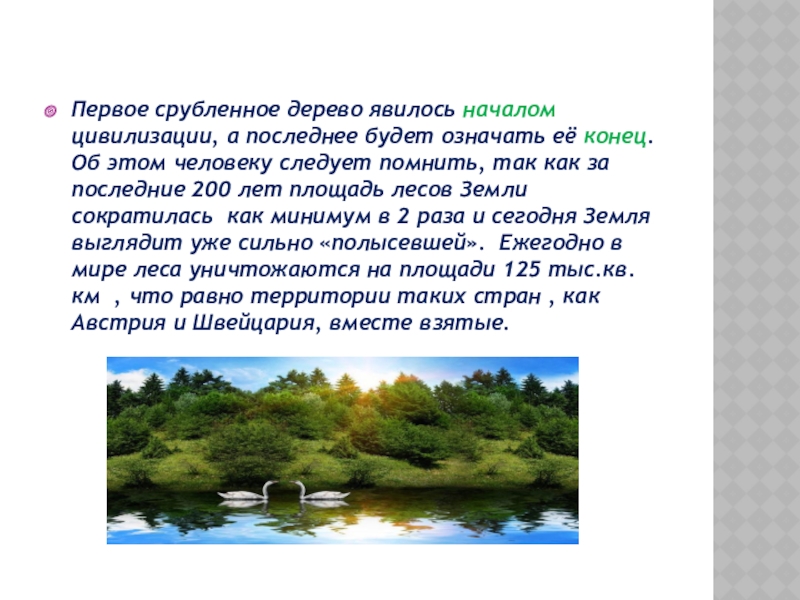 Слайд 20Первое срубленное дерево явилось началом цивилизации, а последнее будет означать её