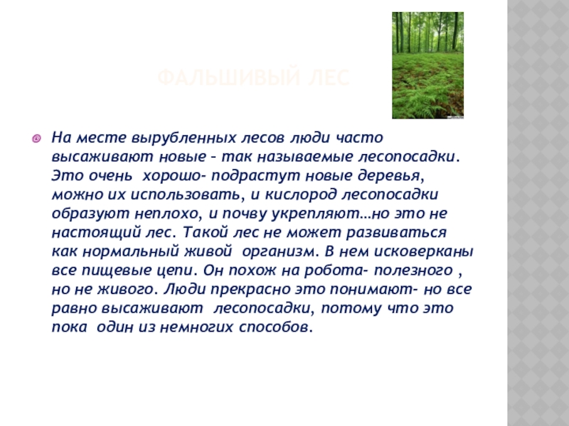 называемые лесопосадки. Это очень хорошо- подрастут новые деревья, можно их использовать, и кислород лесопосадки образуют неплохо, и почву укрепляют…но это не настоящий лес. Такой лес не может развиваться как нормальный живой организм. В нем исковерканы все пищевые цепи. Он похож на робота- полезного , но не живого. Люди прекрасно это понимают- но все равно высаживают лесопосадки, потому что это пока один из немногих способов.