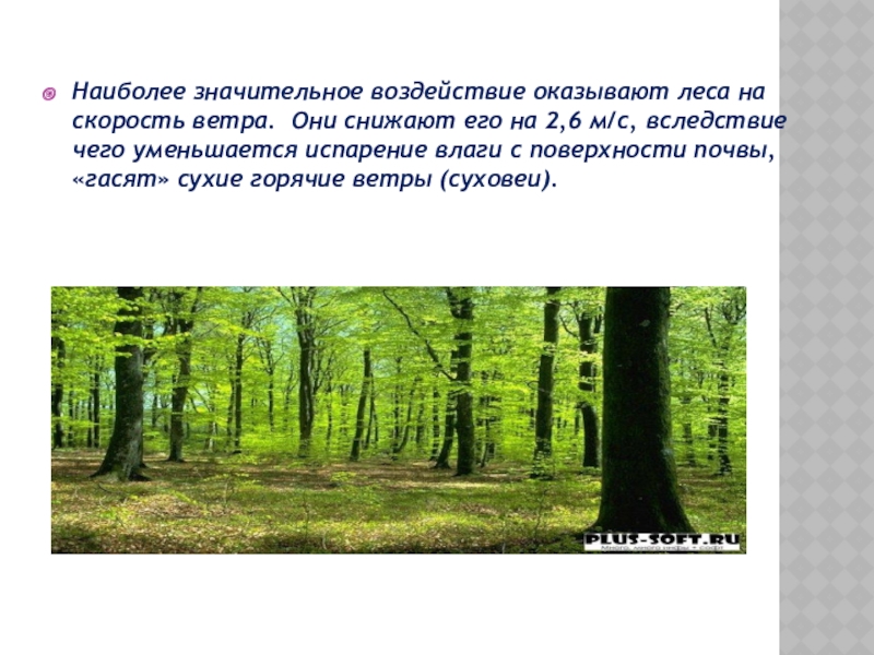 Слайд 10Наиболее значительное воздействие оказывают леса на скорость ветра. Они снижают его