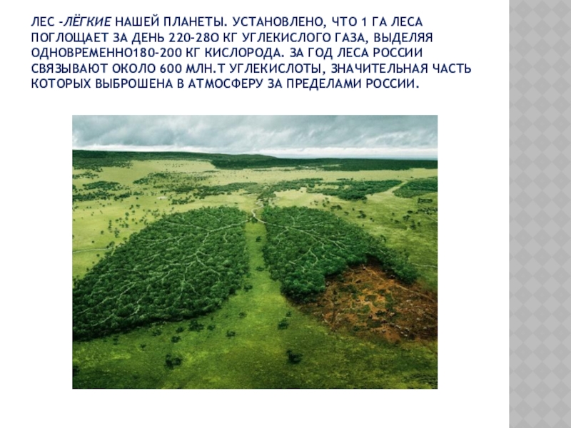 Слайд 8Лес -лёгкие нашей планеты. Установлено, что 1 га леса поглощает за