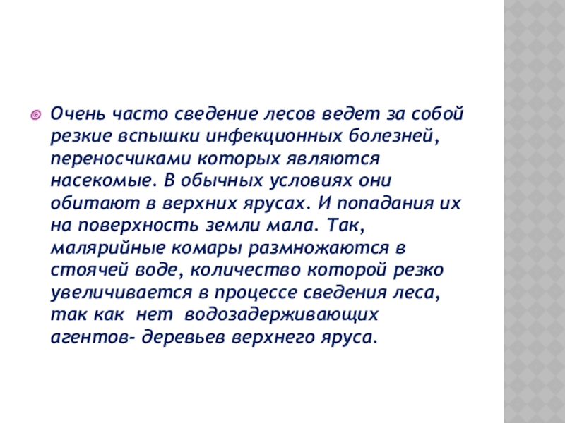 переносчиками которых являются насекомые. В обычных условиях они обитают в верхних ярусах. И попадания их на поверхность земли мала. Так, малярийные комары размножаются в стоячей воде, количество которой резко увеличивается в процессе сведения леса, так как нет водозадерживающих агентов- деревьев верхнего яруса.