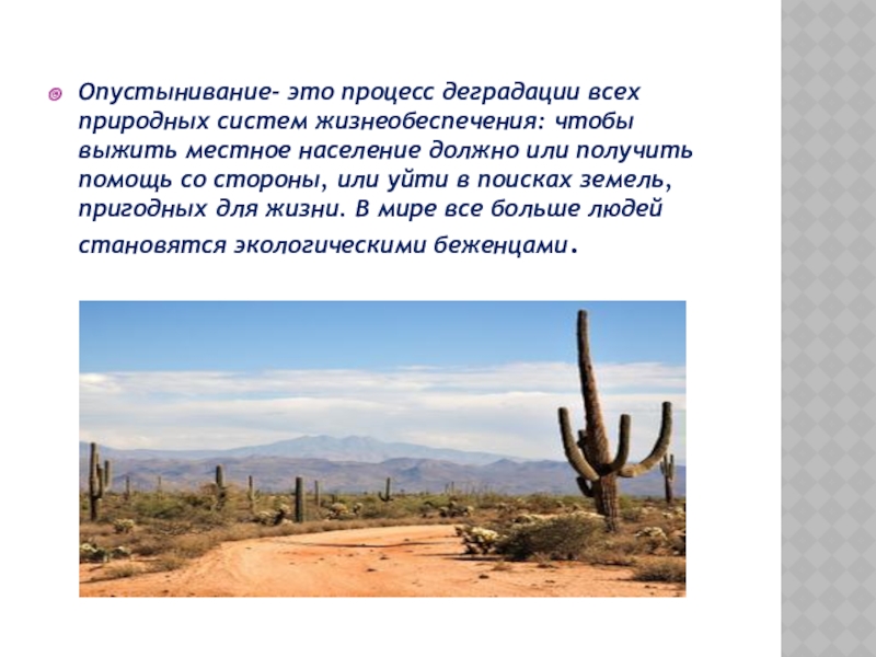 Слайд 16Опустынивание- это процесс деградации всех природных систем жизнеобеспечения: чтобы выжить местное