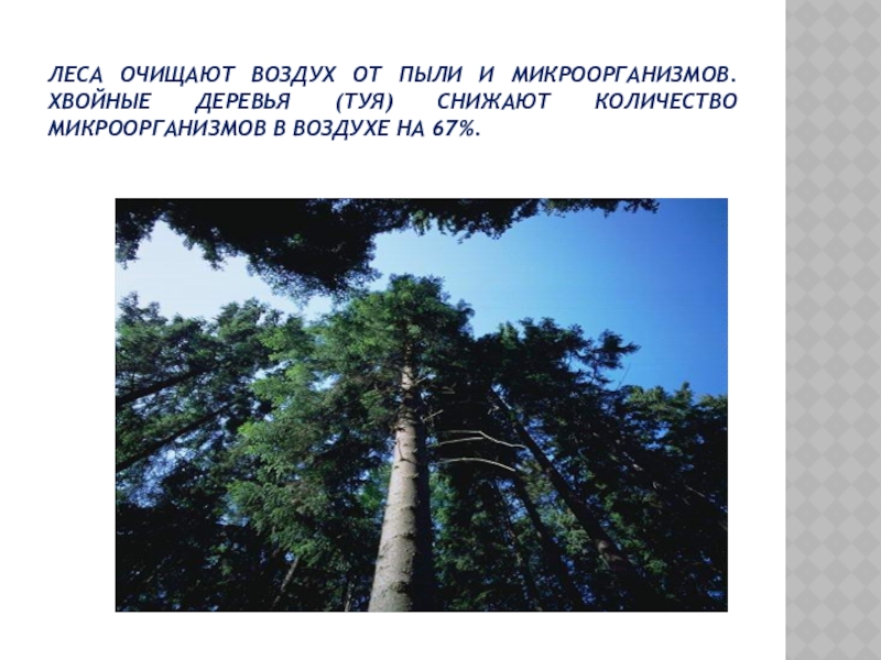 Слайд 11Леса очищают воздух от пыли и микроорганизмов. Хвойные деревья (туя) снижают