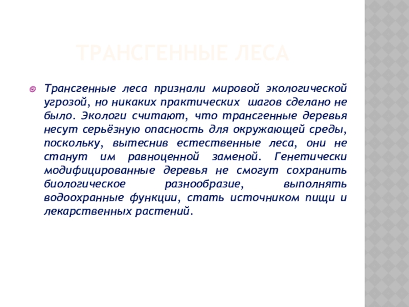 сделано не было. Экологи считают, что трансгенные деревья несут серьёзную опасность для окружающей среды, поскольку, вытеснив естественные леса, они не станут им равноценной заменой. Генетически модифицированные деревья не смогут сохранить биологическое разнообразие, выполнять водоохранные функции, стать источником пищи и лекарственных растений.