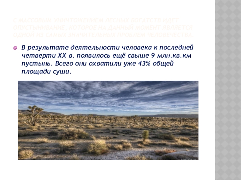Слайд 15С массовым уничтожением лесных богатств идет опустынивание, которое на данный момент