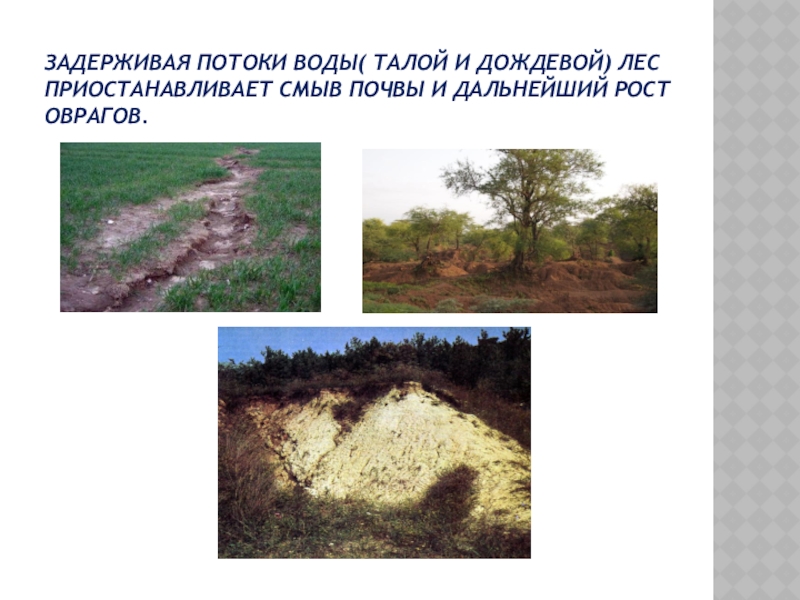 Слайд 14Задерживая потоки воды( талой и дождевой) лес приостанавливает смыв почвы и