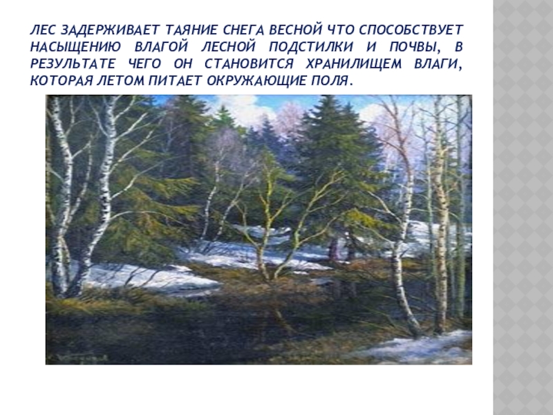 Слайд 12Лес задерживает таяние снега весной что способствует насыщению влагой лесной подстилки