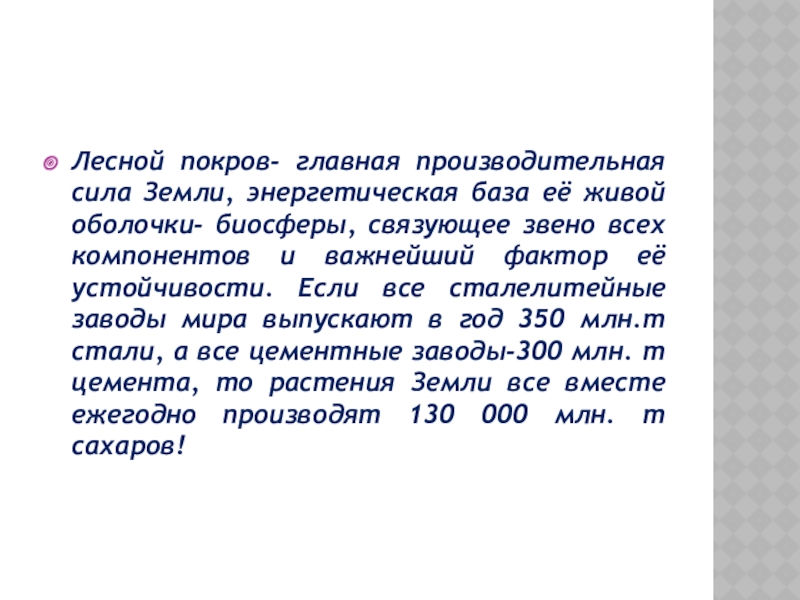Слайд 7Лесной покров- главная производительная сила Земли, энергетическая база её живой оболочки-