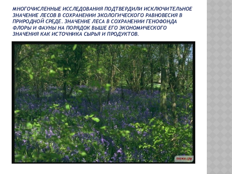 Слайд 5Многочисленные исследования подтвердили исключительное значение лесов в сохранении экологического равновесия в