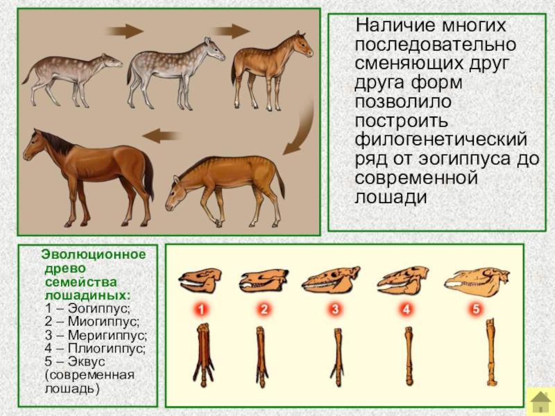 1 – Эогиппус; 2 – Миогиппус; 3 – Меригиппус; 4 – Плиогиппус; 5 – Эквус (современная лошадь)