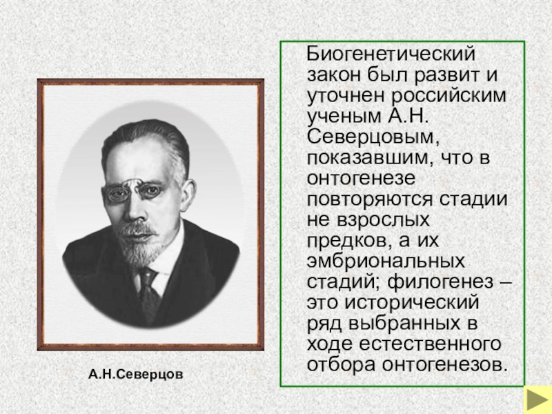 Слайд 34 Биогенетический закон был развит и уточнен российским ученым А.Н.Северцовым,