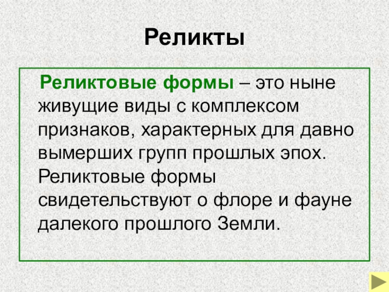 признаков, характерных для давно вымерших групп прошлых эпох. Реликтовые формы свидетельствуют о флоре и фауне далекого прошлого Земли.
