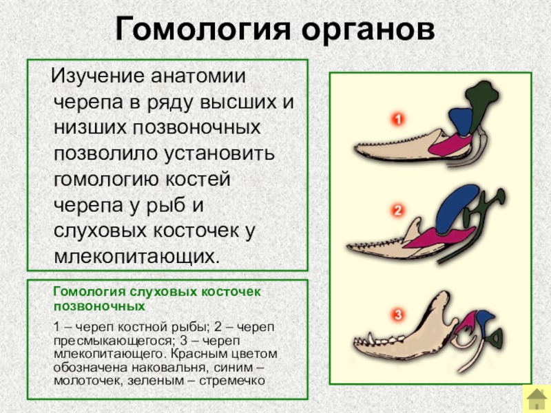 Изучение анатомии черепа в ряду высших и низших позвоночных позволило установить гомологию костей черепа у рыб и слуховых косточек у млекопитающих.