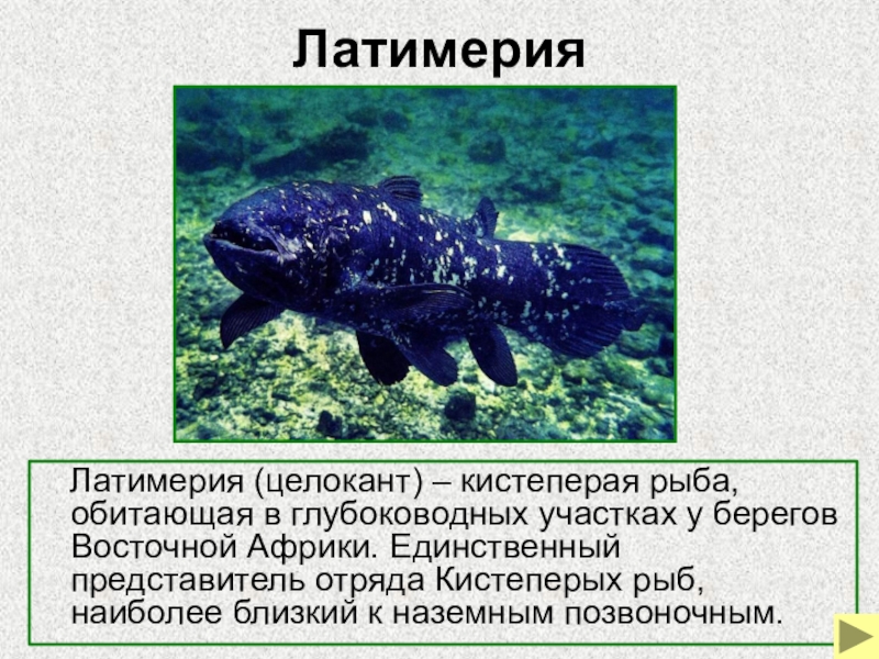 у берегов Восточной Африки. Единственный представитель отряда Кистеперых рыб, наиболее близкий к наземным позвоночным.