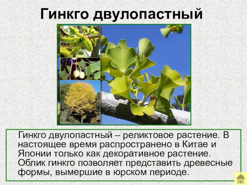 время распространено в Китае и Японии только как декоративное растение. Облик гинкго позволяет представить древесные формы, вымершие в юрском периоде.