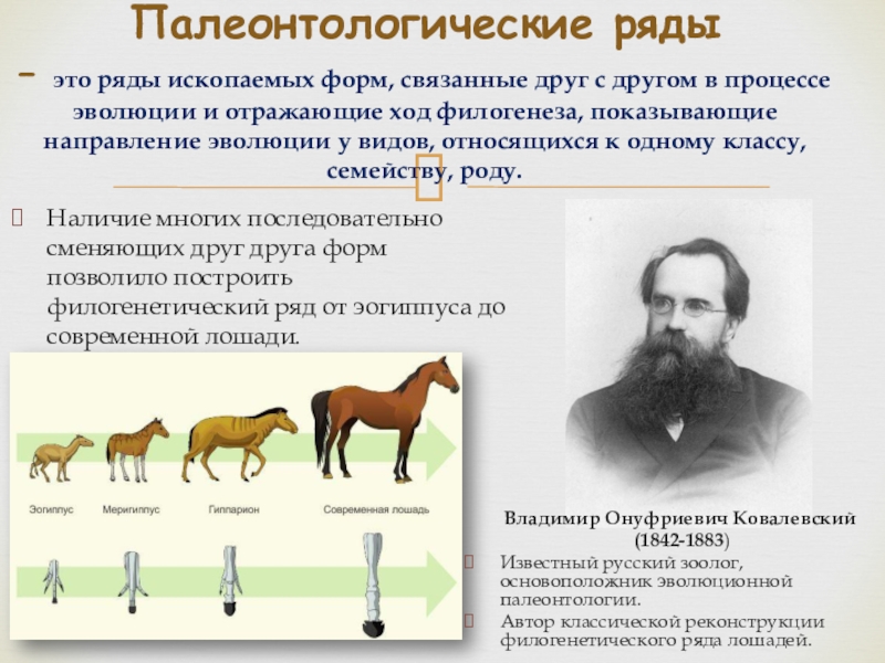 Наличие многих последовательно сменяющих друг друга форм позволило построить филогенетический ряд от эогиппуса до современной лошади.