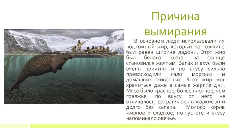Причина вымирания   В основном люди использовали их подкожный жир, который по толщине был равен ширине