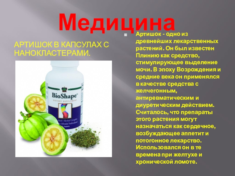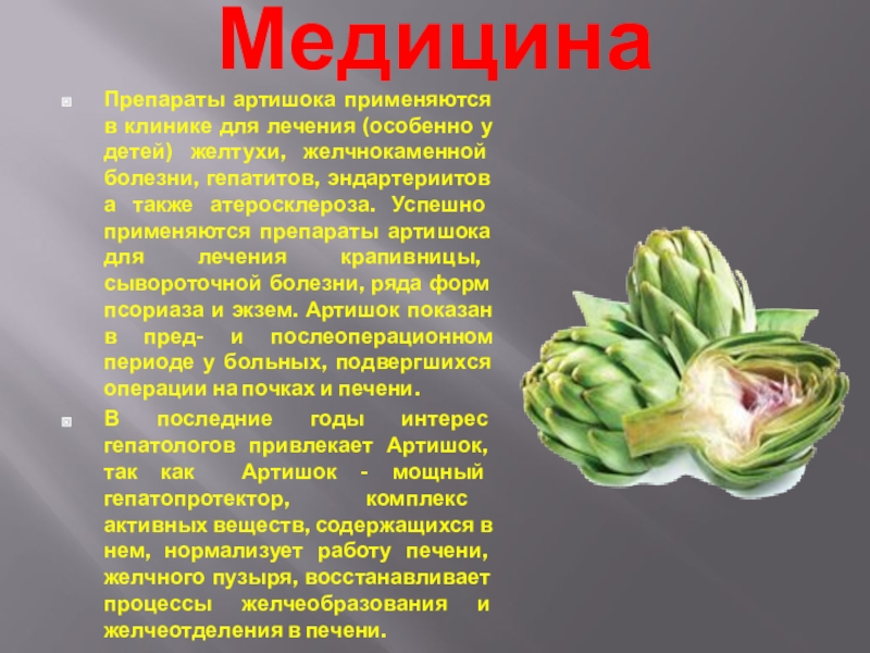 желчнокаменной болезни, гепатитов, эндартериитов а также атеросклероза. Успешно применяются препараты артишока для лечения крапивницы, сывороточной болезни, ряда форм псориаза и экзем. Артишок показан в пред- и послеоперационном периоде у больных, подвергшихся операции на почках и печени.