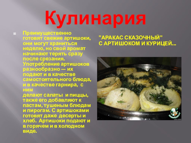но свой аромат начинают терять сразу после срезания. Употребление артишоков разнообразно — их подают и в качестве самостоятельного блюда, и в качестве гарнира, с ним делают салаты и пиццы, также его добавляют к пастам, тушеным блюдам и пирогам. С артишоками готовят даже десерты и хлеб. Артишоки подают и в горячем и в холодном виде.
