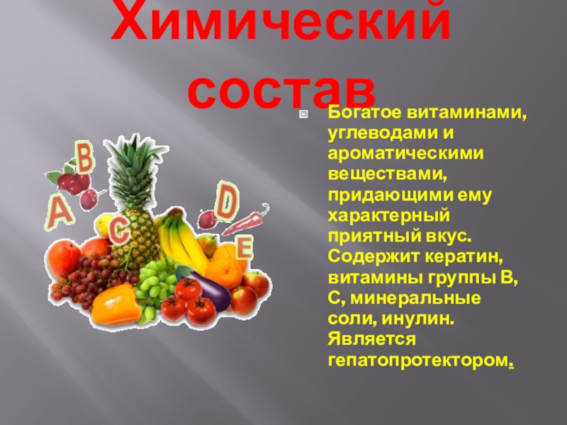 вкус. Содержит кератин, витамины группы В, С, минеральные соли, инулин. Является гепатопротектором.